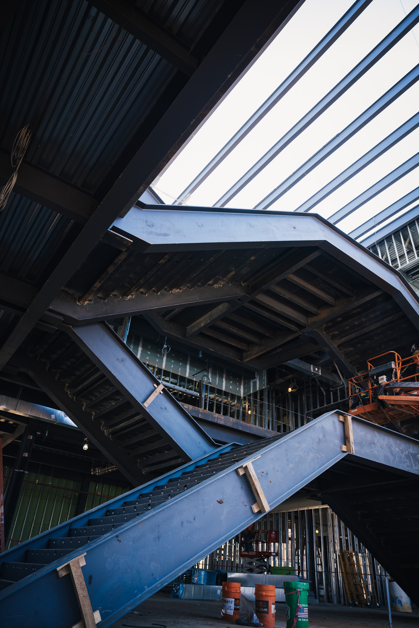 The steel stair and rail scope included one monumental stair, four additional stair systems, and stainless-steel stair railings throughout the facility.