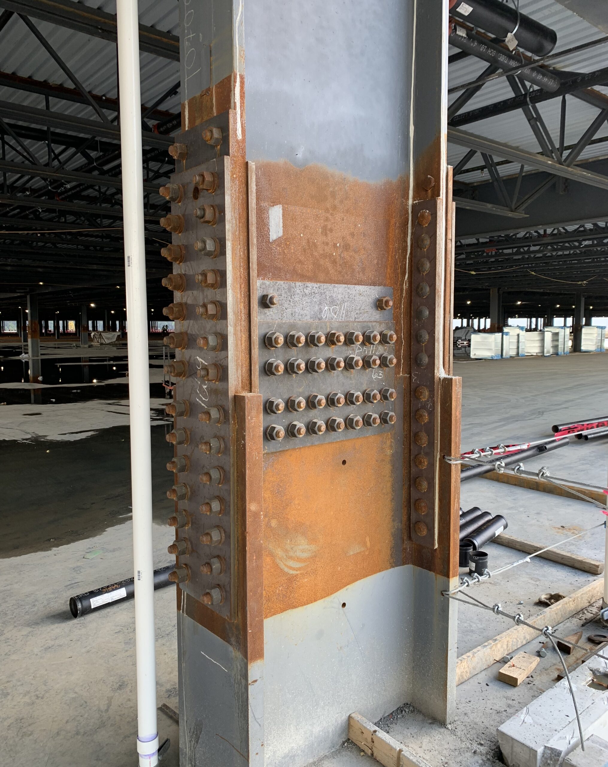 SSE engineered a wide variety of connections throughout the project, including composite joist connections, column splices, axial beam connections, moment connections, and vertical bracing connections. The primary force-resisting system consisted of heavily loaded moment frames. To accommodate the preferences of the fabricator and erector, we implemented a hybrid moment connection design that utilized a complete joint penetration (CJP) welded top flange and a bolted bottom flange.