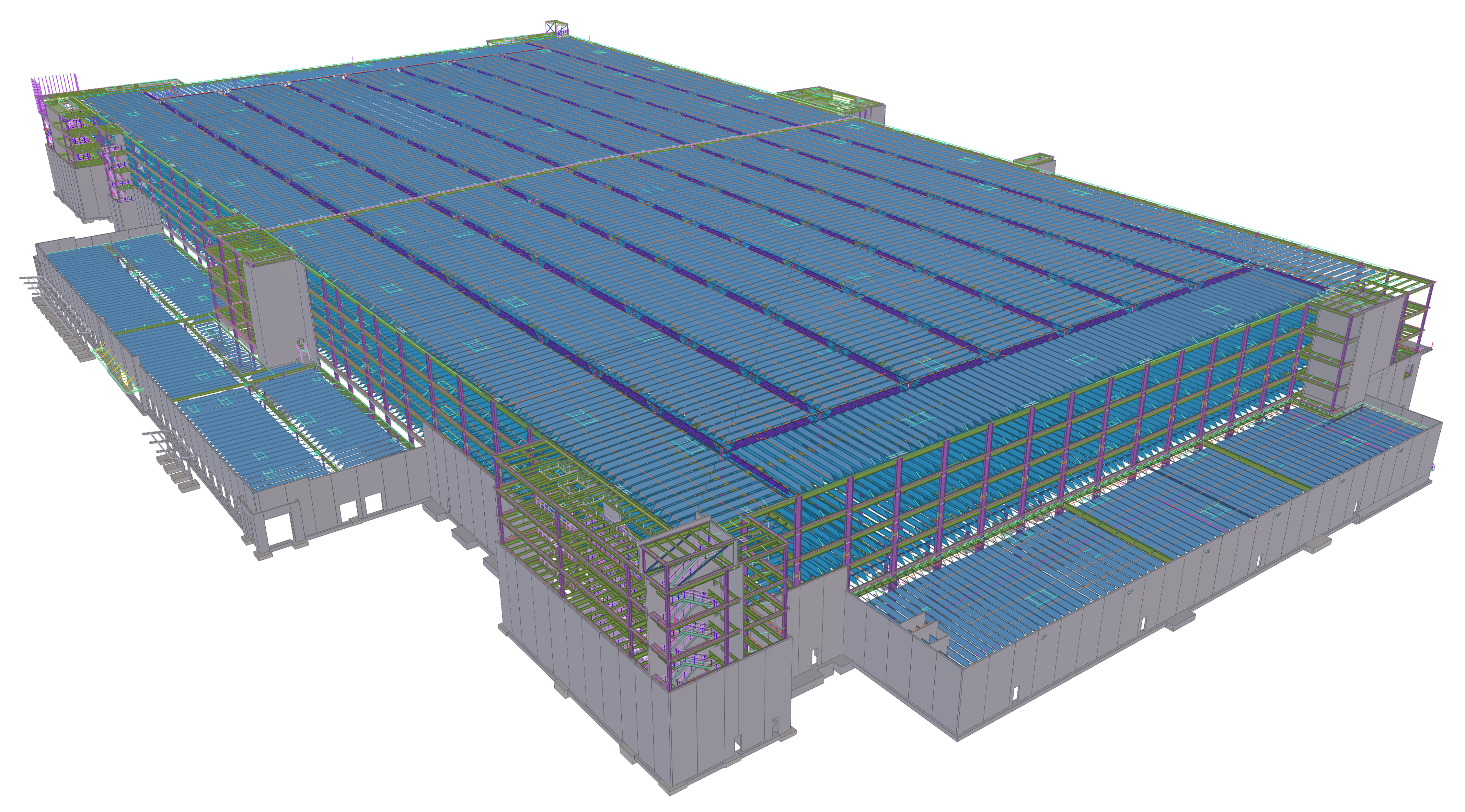 Southern Steel Engineers provided connection and miscellaneous steel design services for Project Live Oak, a five-story Amazon sorting and fulfillment center in Chatham County, Georgia. The 640,000-square-foot facility was designed to accommodate the demands of large-scale e-commerce operations and included both complex structural connections and extensive miscellaneous steel features.