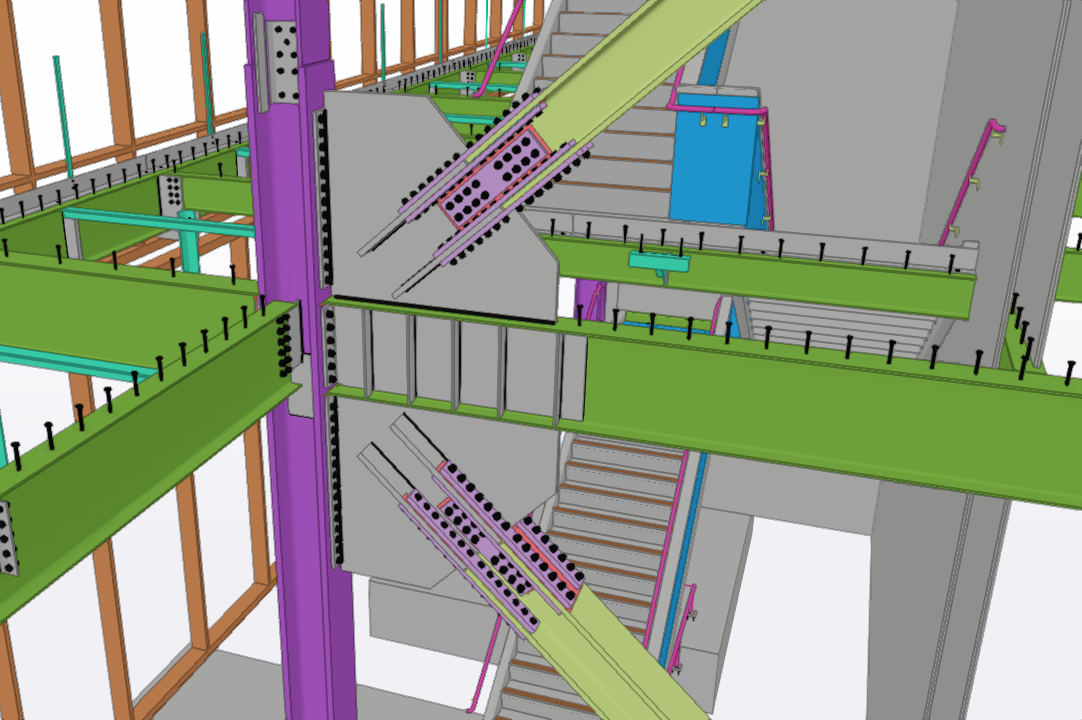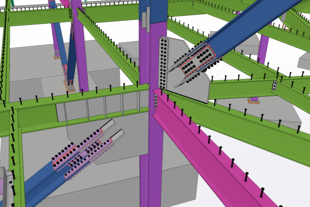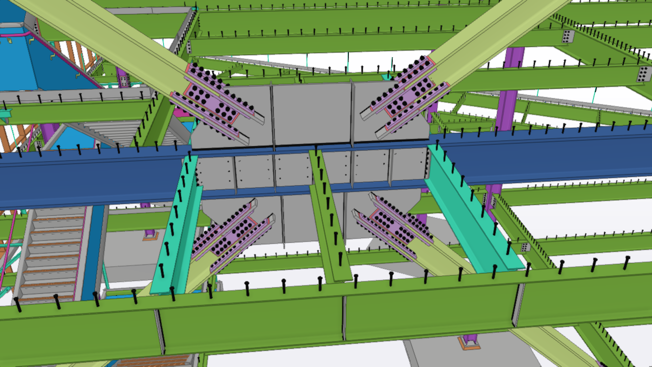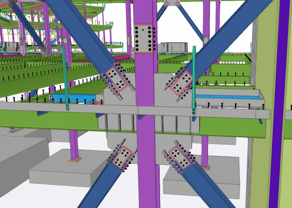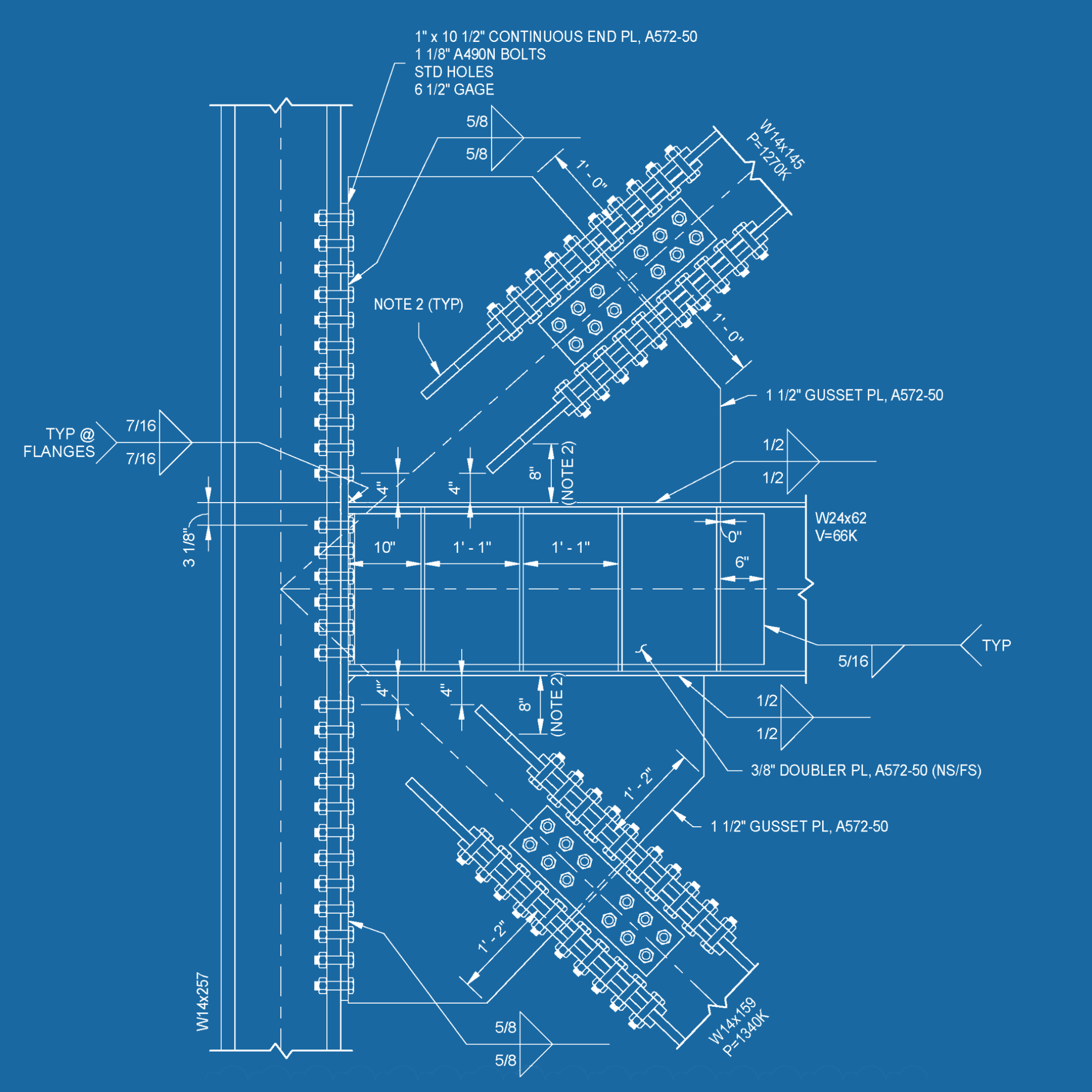 SSE engineered connections for a wide range of structural elements, including heavy wide-flange vertical bracing, axial and moment connections, column splices, horizontal bracing, hollow structural section (HSS) members, and skewed connections. To accommodate fabricator preferences, we implemented hybrid moment connections with complete joint penetration (CJP) welded top flanges and bolted bottom flanges.