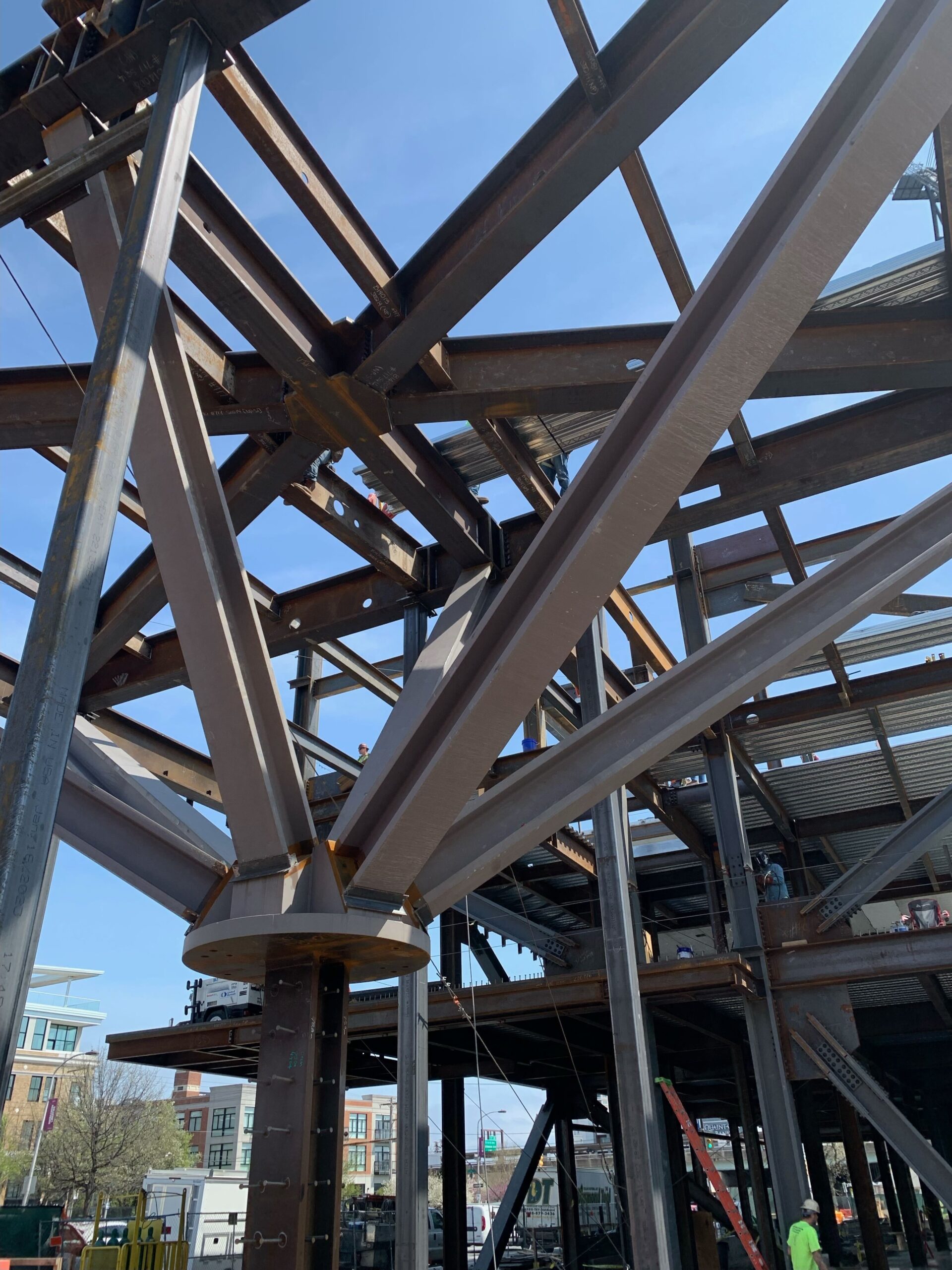The team also designed HSS connections subject to torsion and horizontal shear forces that were offset from column lines, ensuring both stability and constructability. Additionally, heavy moment connections exceeding 4,000 k-ft were analyzed and engineered to accommodate the building’s unique load paths and architectural configuration.